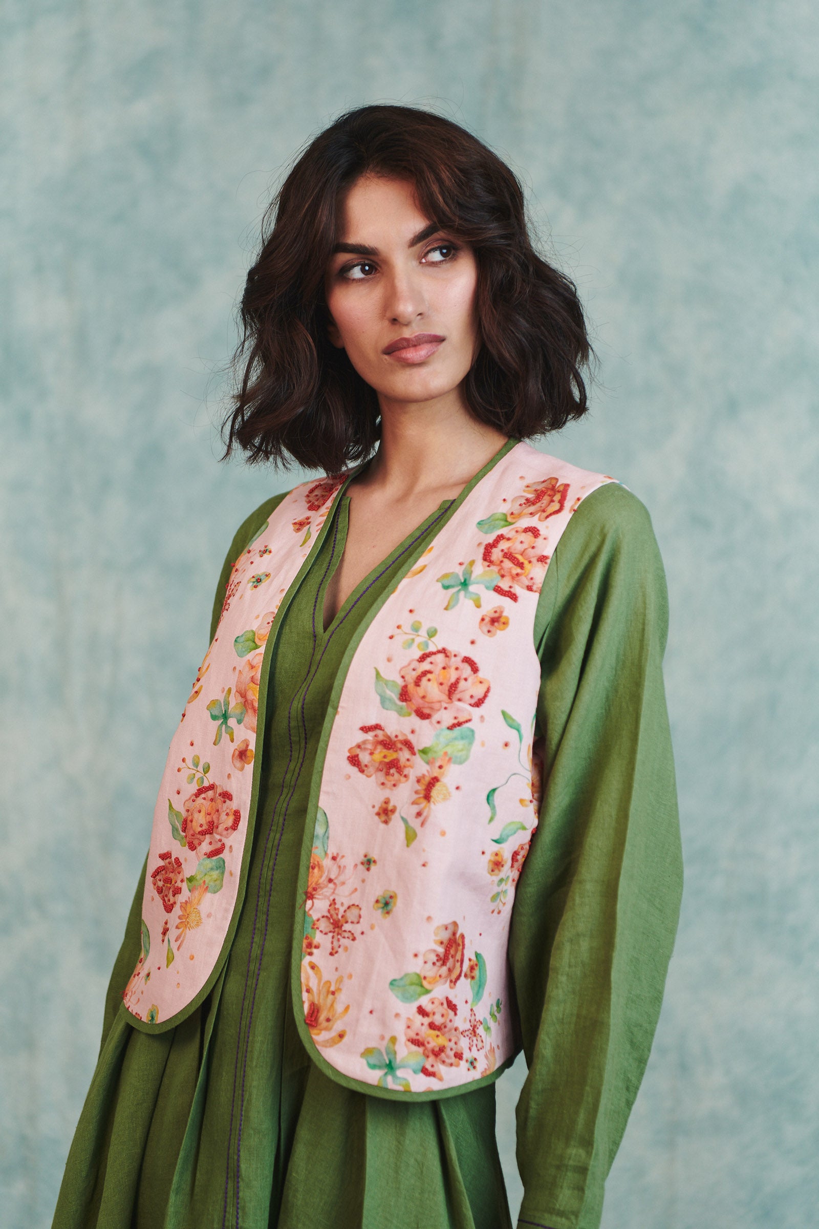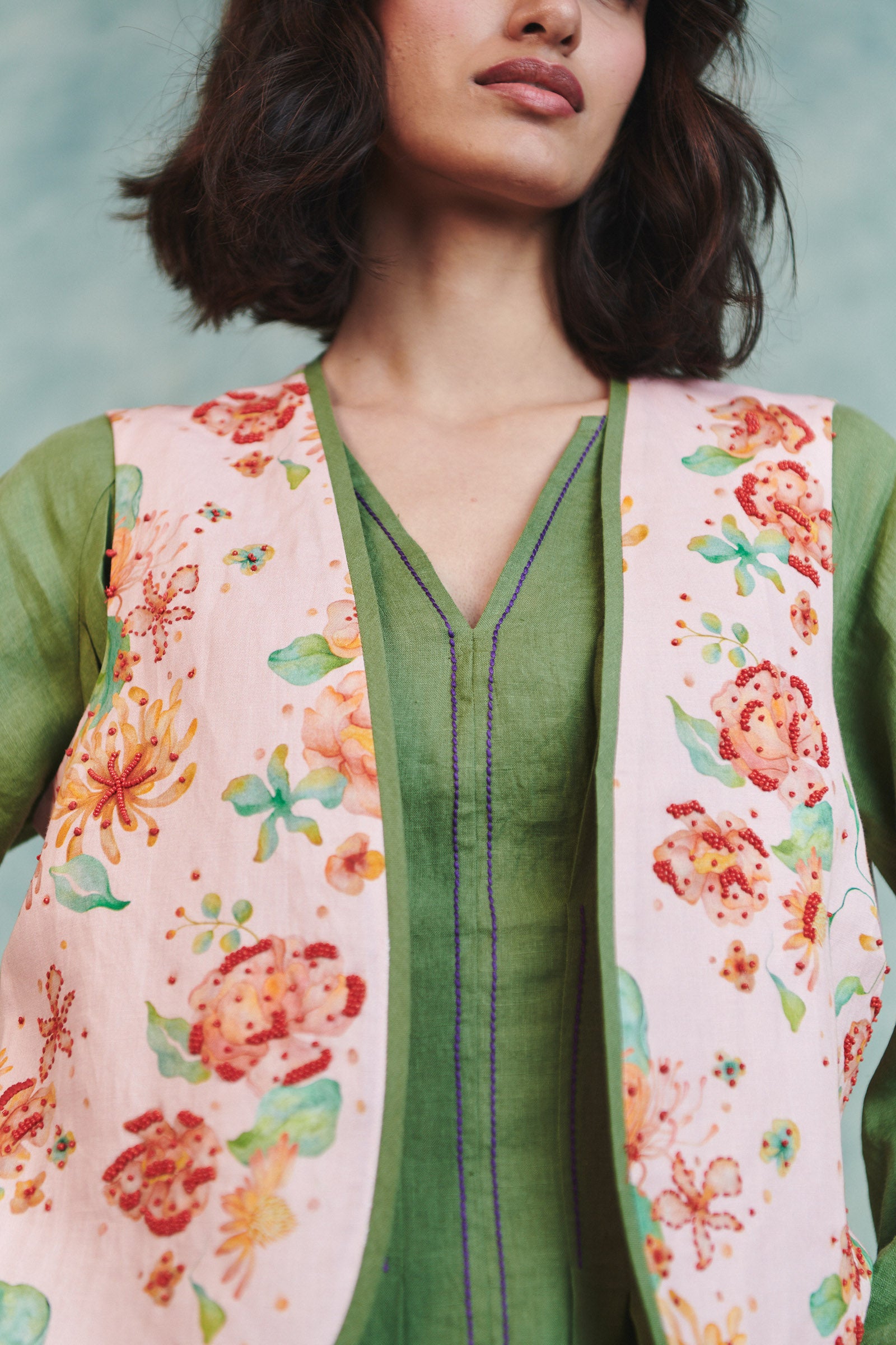 Flora Co-Linen Embroidered Rounded Waistcoat