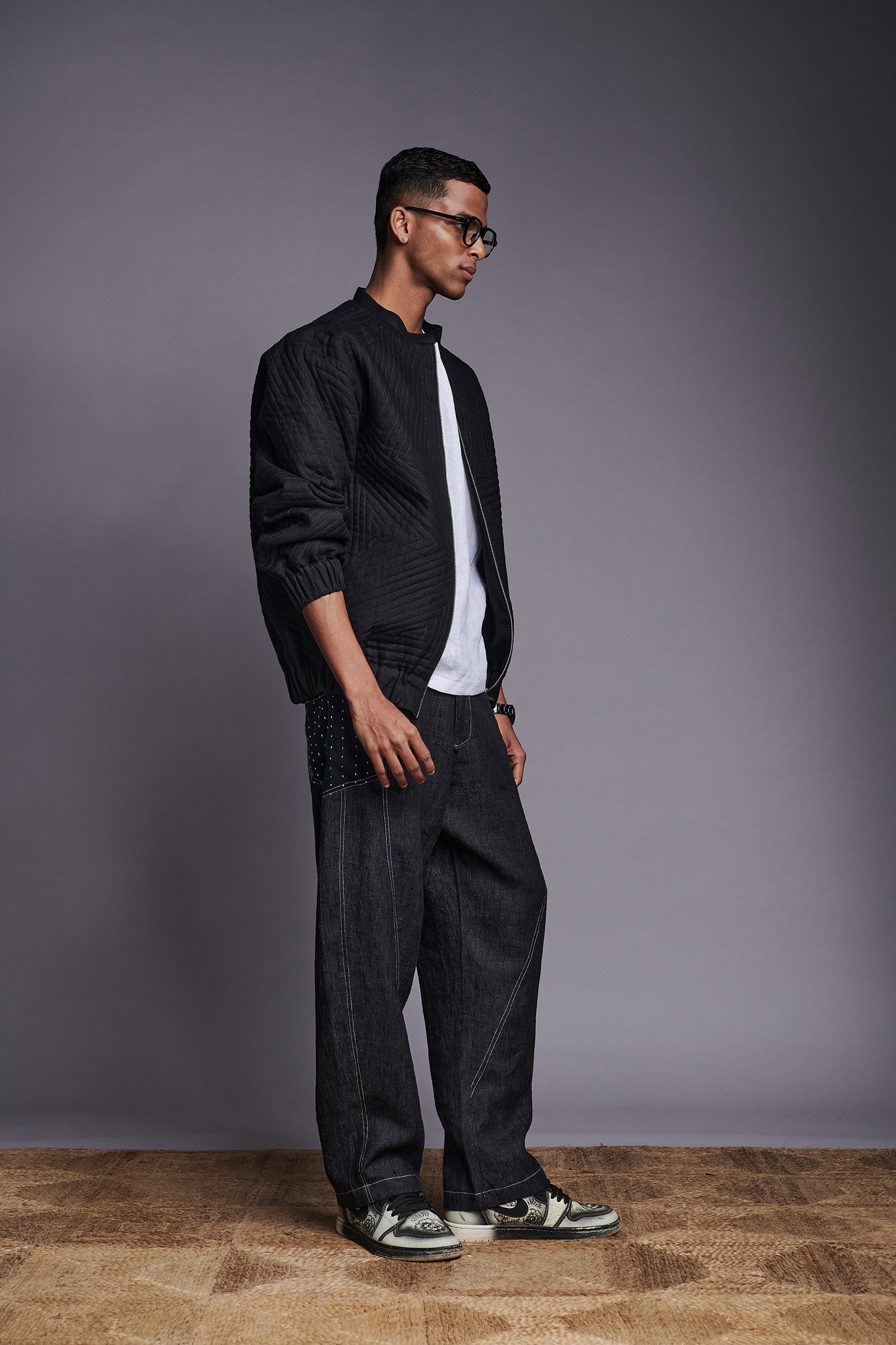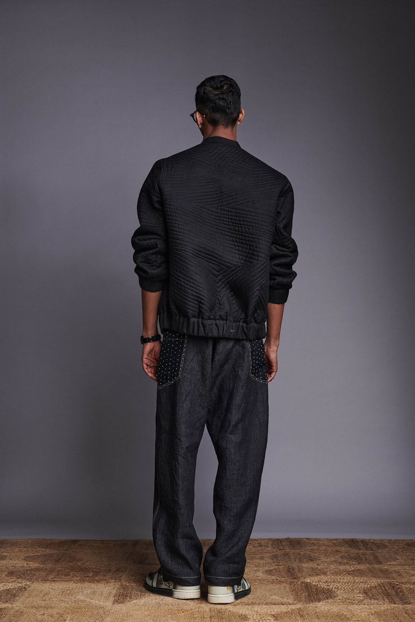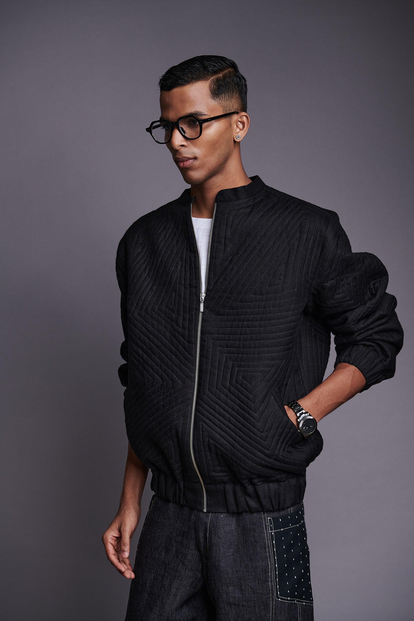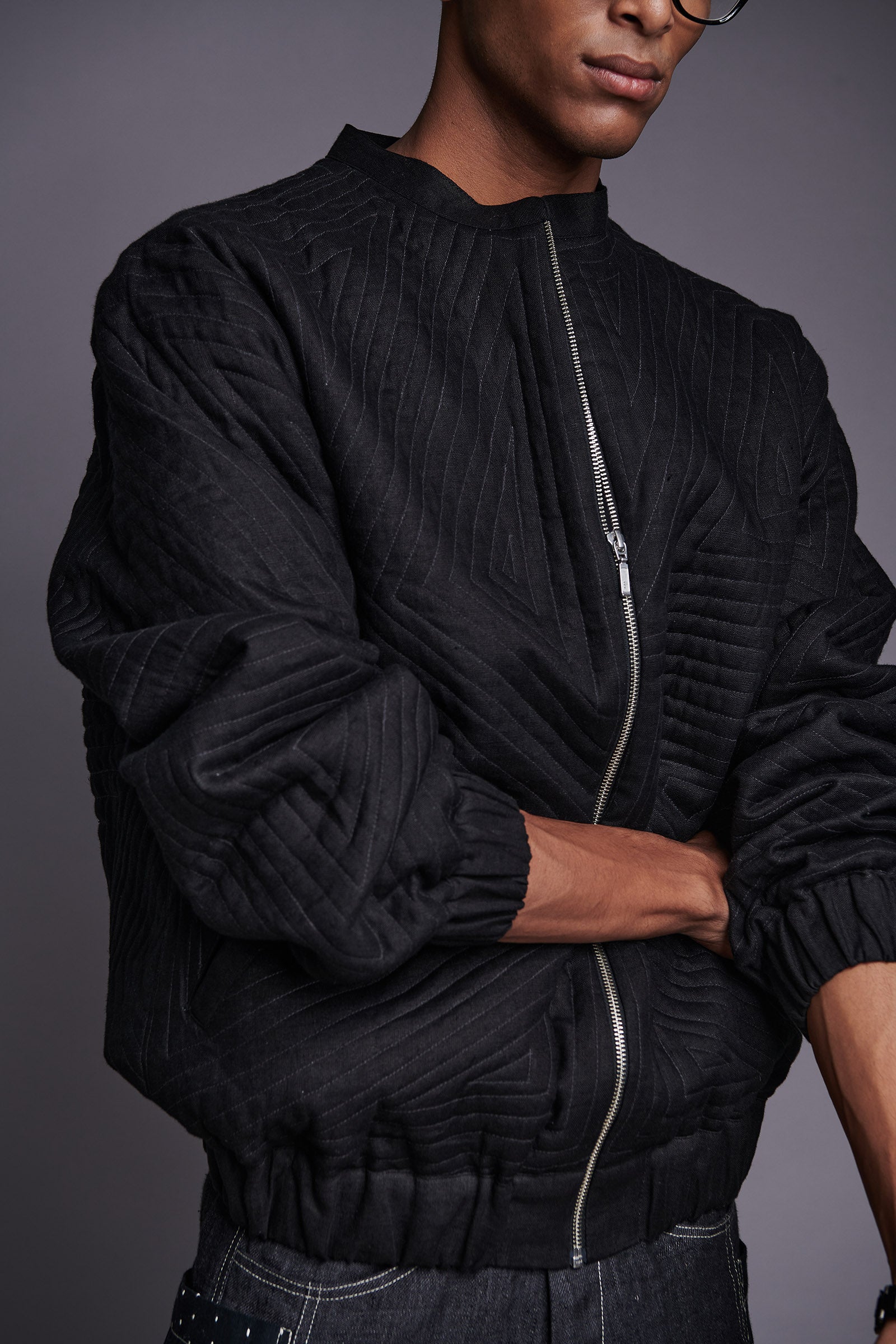 Geometric quilting defines this unisex bomber jacket, giving it texture and a bold yet controlled look. The silhouette stays relaxed with gathered cuffs and a shaped waistband. A colour-pop lining inside brings a quiet edge to the clean exterior.