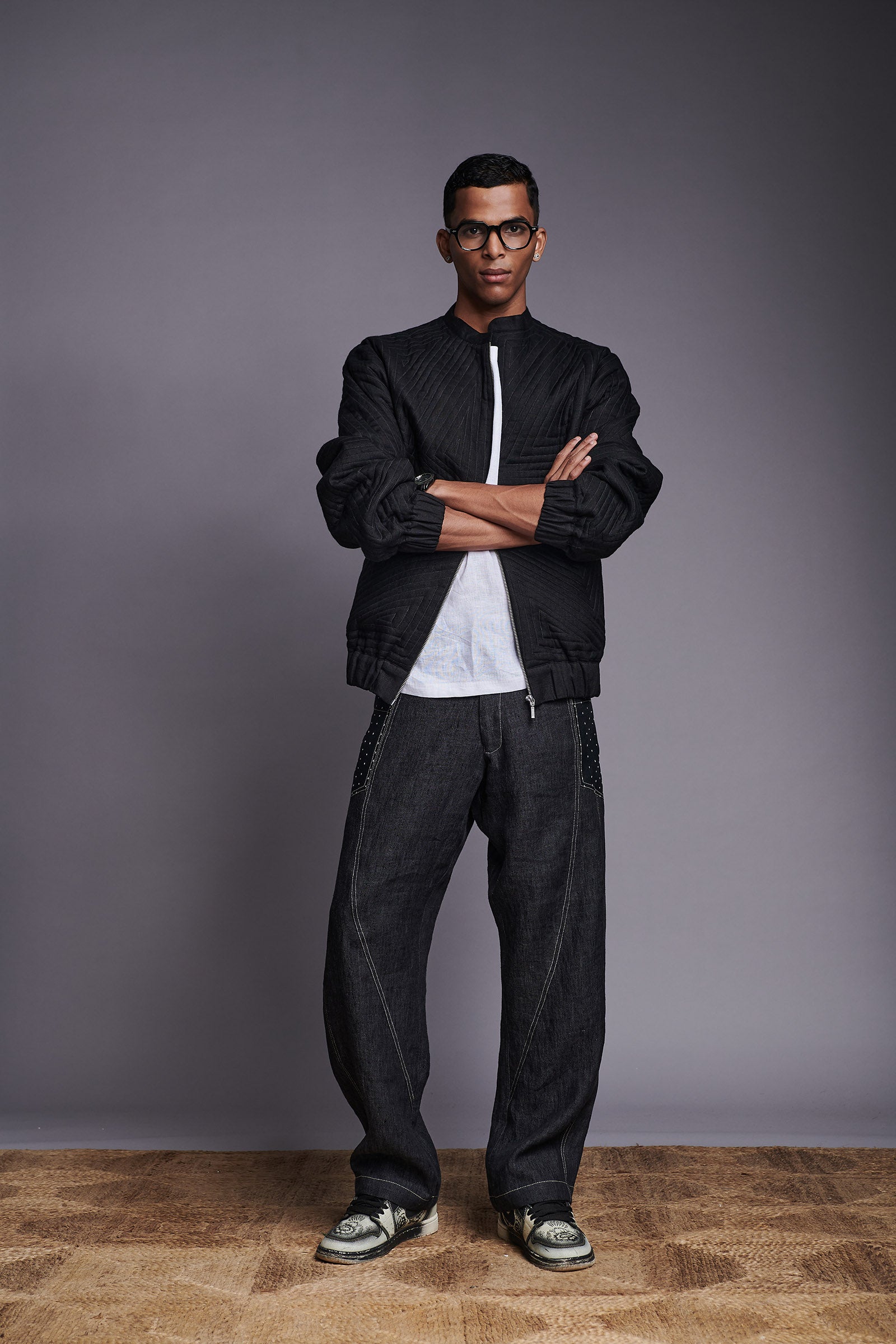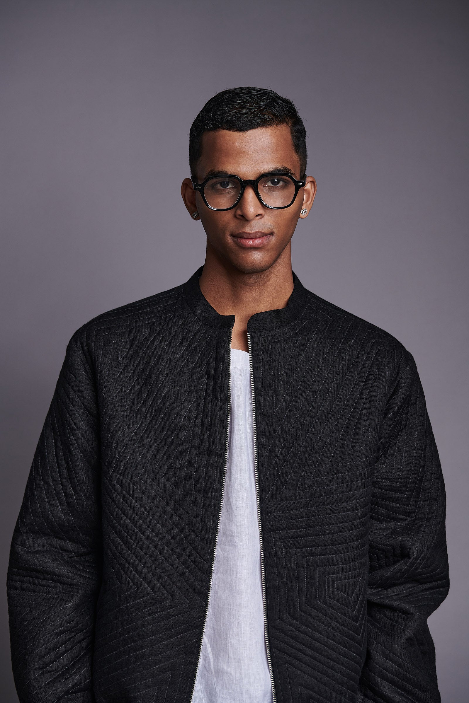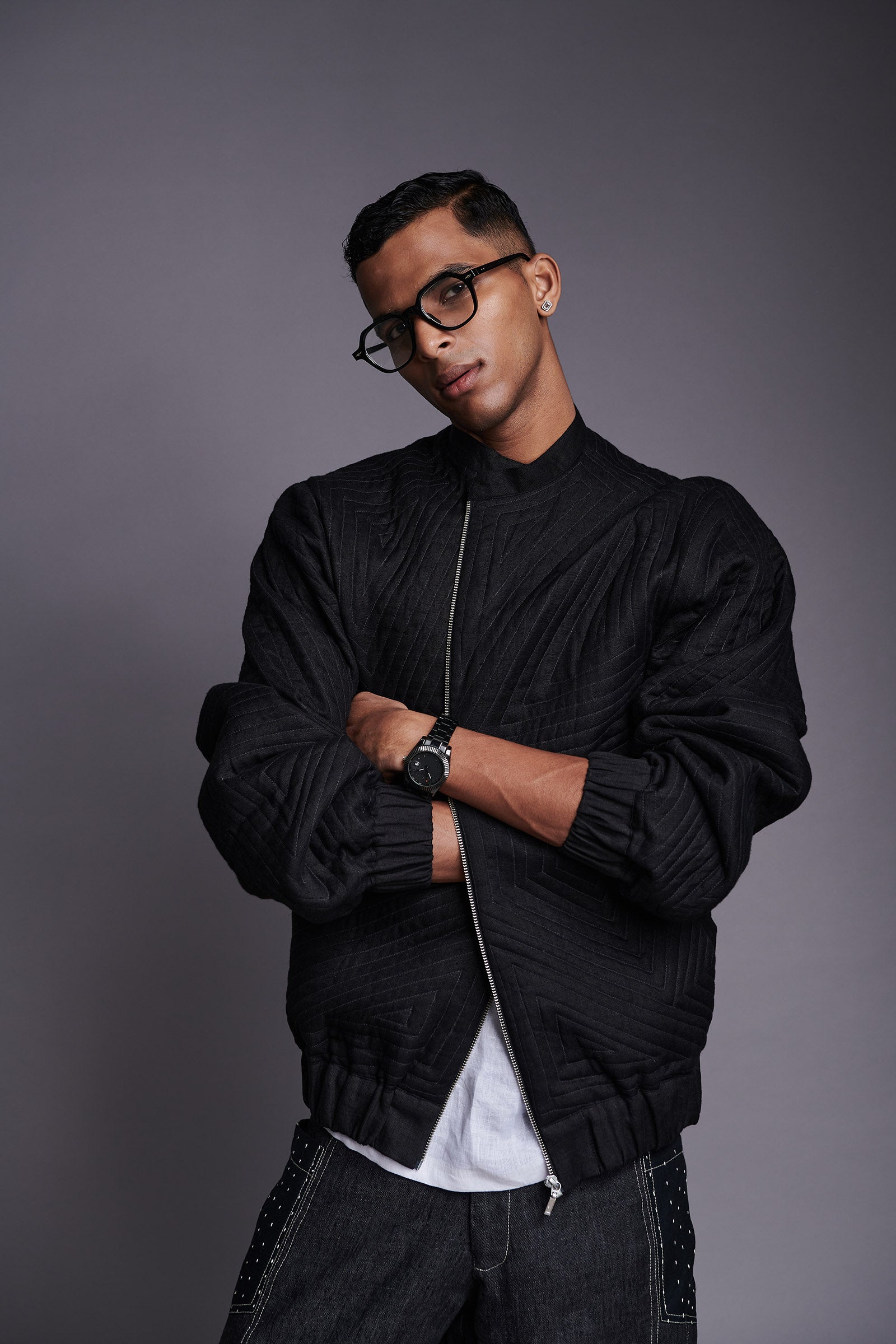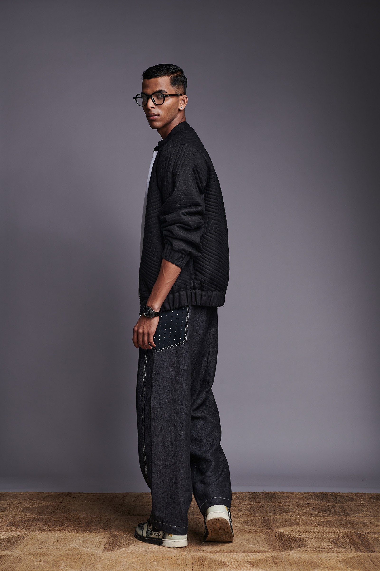 Geometric quilting defines this unisex bomber jacket, giving it texture and a bold yet controlled look. The silhouette stays relaxed with gathered cuffs and a shaped waistband. A colour-pop lining inside brings a quiet edge to the clean exterior.